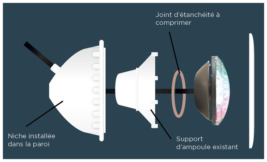 NB : le joint à placer sur la calotte est celui de votre installation existante, et n'est donc pas inclus avec la lampe LED NS. Il contribue à renforcer l'étanchéité de l'ampoule.