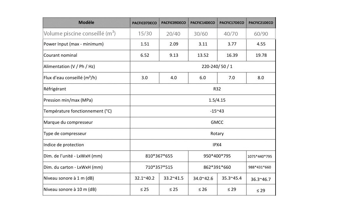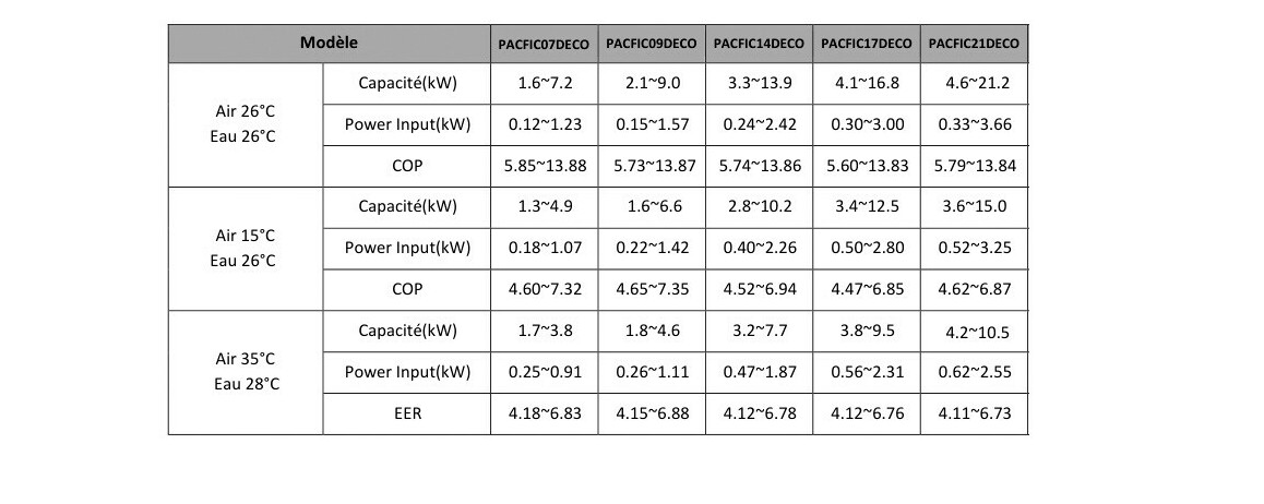 - Cop supérieur à 13 (Air 26°C - Eau 26°C)