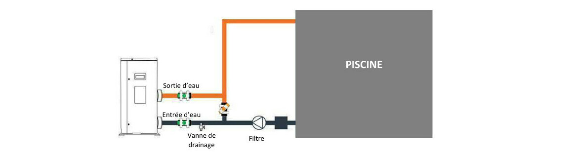 - Le raccordement d'un appareil de traitement chimique doit être effectué après la pompe à chaleur