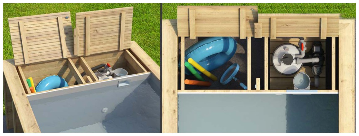 - Inutile de posséder un local technique : la filtration se trouve à l'intérieur du grand coffre intégré tout en laissant un large espace de rangement .
