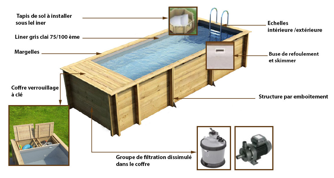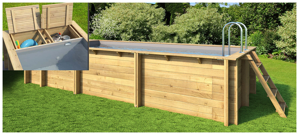 La piscine en bois Pool'N Box est proposée avec tout un équipement pour la filtration, le rangement et le confort de baignade.