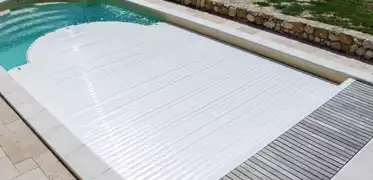 Les volets roulants peuvent être mis en place sur mesure. Ils sont dotés de lames, en PVC, se déployant et flottant directement sur la surface de l'eau.