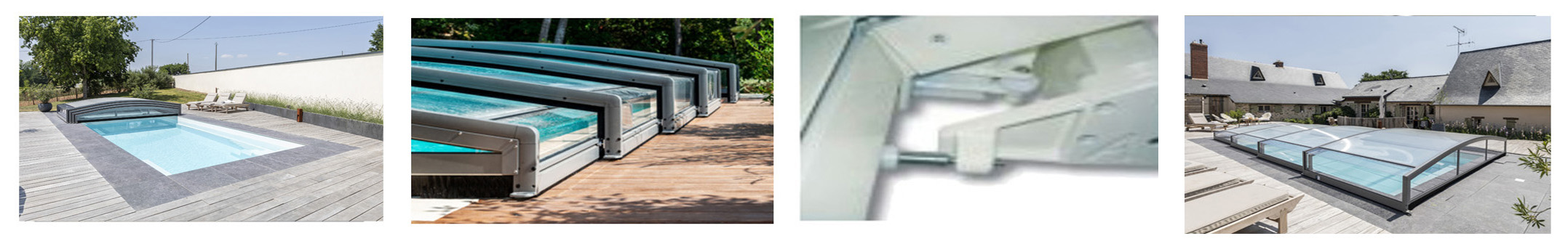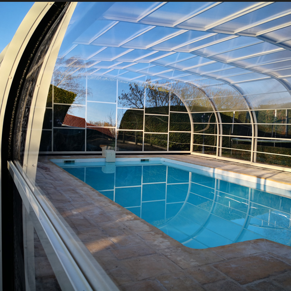 Carat | Bas / Mi-haut | Quadruple | Mi-haut | Polycarbonate thermoformé | 78 mm | Polycarbonate alvéolaire 8 mm anti-UV | 2 sens + intermodules | Oui | Jusqu'à 12 x 6 m | Motorisation, découpe personnalisée, réhaussement, coloris RAL 1013/9007 | Trajectoire parfaitement linéaire, confort de baignade sous abri |