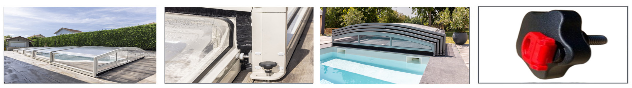 Carat | Bas / Mi-haut | Quadruple | Mi-haut | Polycarbonate thermoformé | 78 mm | Polycarbonate alvéolaire 8 mm anti-UV | 2 sens + intermodules | Oui | Motorisation, découpe personnalisée, réhaussement, coloris RAL 1013/9007 | Trajectoire parfaitement linéaire, confort de baignade sous abri |