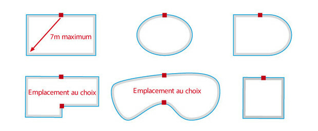 - Elle doit être placée au milieu de la plus grande longueur du bassin sur une margelle (configuration pour une piscine rectangulaire).