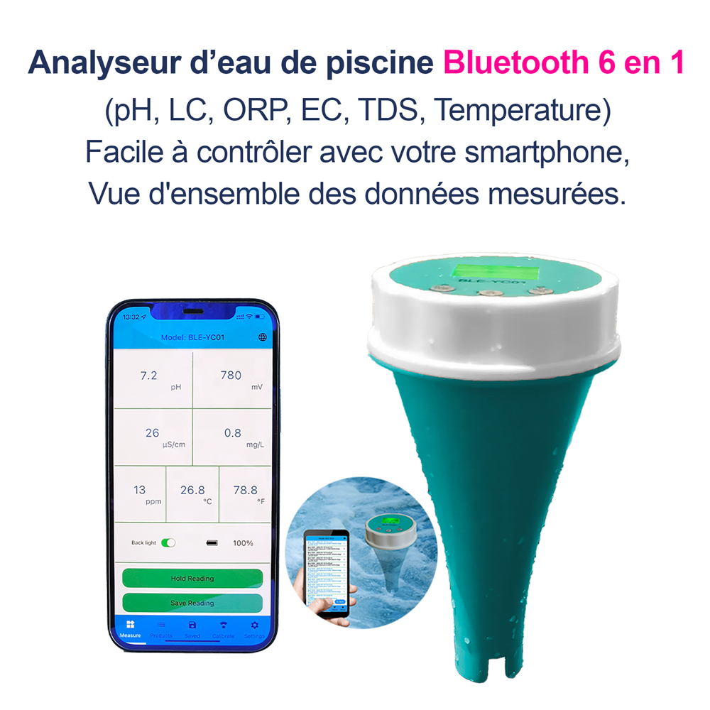 Ce testeur flottant se place directement dans l’eau et analyse ses paramètres. Toutes les données relatives à votre eau de piscine, seront transmises en temps réel, directement sur votre Smartphone : pH, CL, ORP, EC, TDS et température, tout y est !