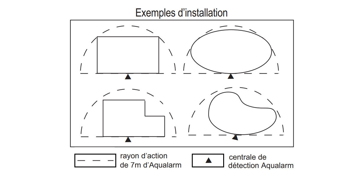 - Pour les piscines de grande taille ou de forme très complexe, vous devez vous équiper d'une ou plusieurs centrales de détection supplémentaires pour satisfaire aux exigences de la norme