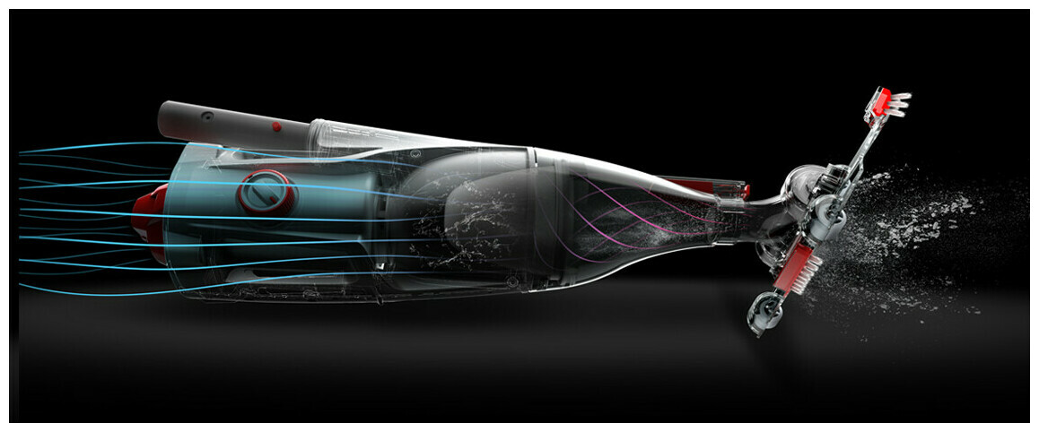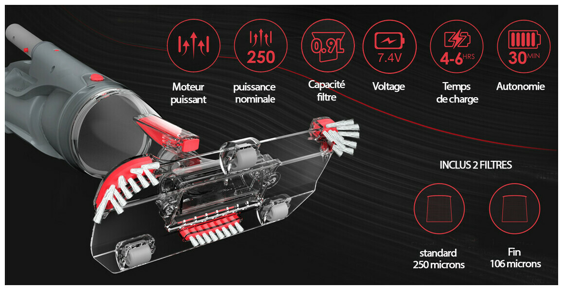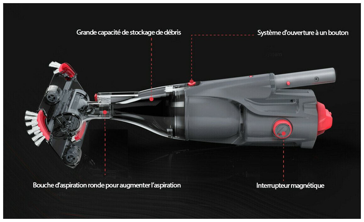 - Large tête d'aspiration pivotantes avec roues et brosses latérales pour un nettoyage dans tous les recoins