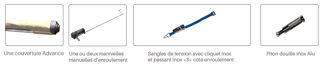 Les couvertures à barres Advance sont fabriquées à partir de tissu enduit PVC pesant 580 g/m² et intègrent un système de fixation grâce à des barres en aluminium anodisé. Elles sont pourvues de cavités permettant le drainage des eaux de pluie et sont fournies avec une manivelle manuelle à démultiplication.