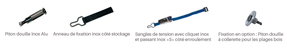 - Fixation au sol à l'aide de pitons douille alu / inox (possibilité d'avoir des pitons douille à collerette pour plage en bois en option)