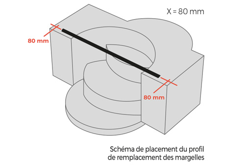 - Si votre piscine est équipée d'un escalier sur la longueur, disposez préalablement le profil de remplacement de margelle conformément au schéma (voir schéma Installation).