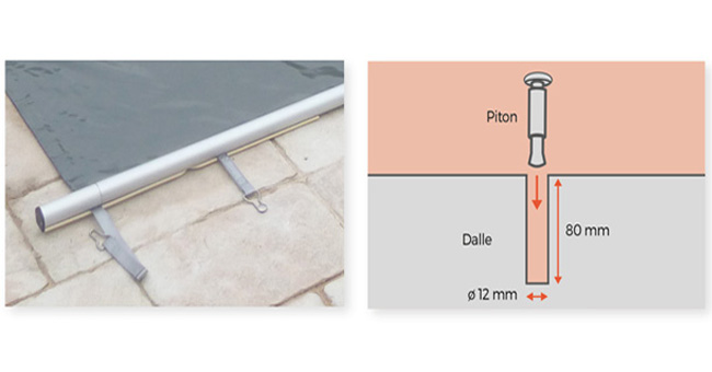- Fixez les pitons douille Inox Alu à l'extérieur du bassin, sur une surface dallée permanente et solide.