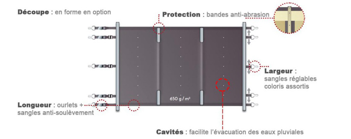 - Tissu enduit PVC : 650 g/m², traitement anti-UV et anti fongicide