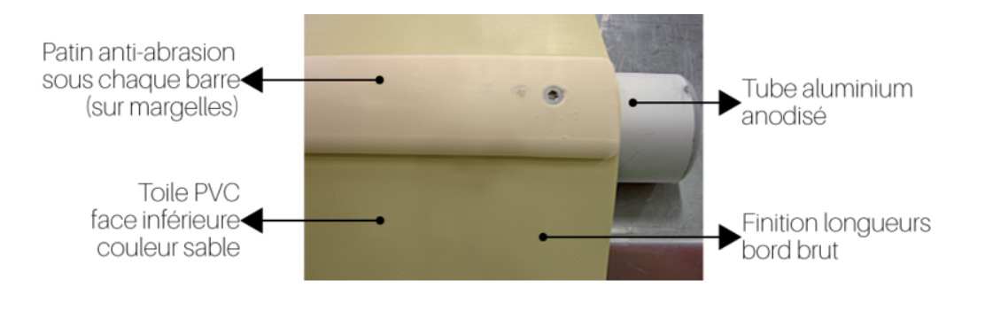 - Largeurs à ourlets soudés équipées de courroies et cliquets de tension, brut de coupe sur les longueurs.