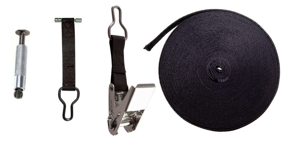 - Fixation au sol : pitons douilles inox/alu, courroies de tensino avec anneaux inox côté stockage, sangle coloris noir avec cliquet inox côté enroulement.
