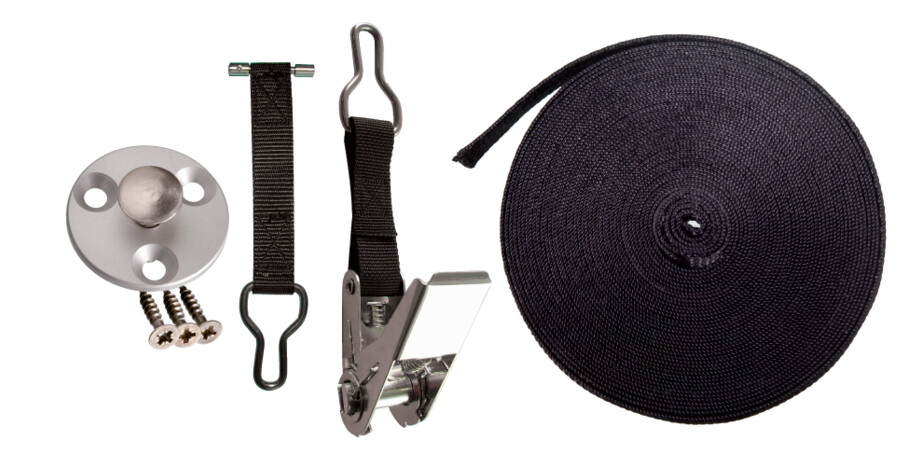 - Largeurs équipées de courroies de fixation et de tension réglables latéralement par translation, avec anneaux ou tendeurs cliquets en inox.
