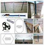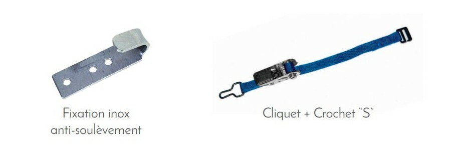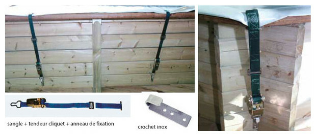 - Accrochage simplifié avec les sangles avec tendeurs à cliquets et anneaux inox qui se positionnent dans des crochets inox à fixer sur les parois de la piscine