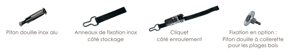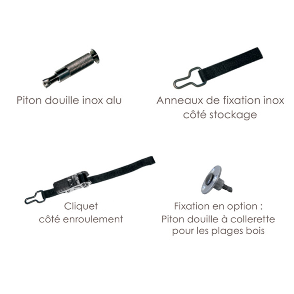 Système accrochage | Côté stockage : sangles fixes noires avec anneaux Côté enroulement : sangles fixes noires avec cliquets |