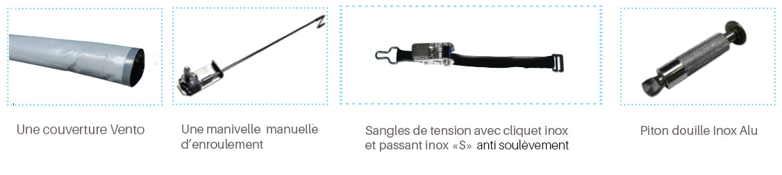 - Un ensemble d'accessoires requis pour l'installation de la couverture (cliquets, pitons)