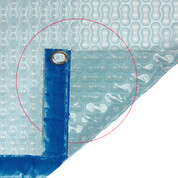 Finitions | Bordée 2 côtés : Renfort polyéthylène bleu cousu sur deux largeurs avec oeillets à chaque angle opposé et tous les 0.50 m côté enrouleur |