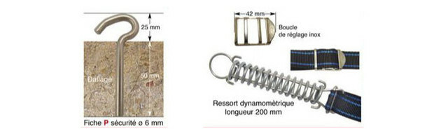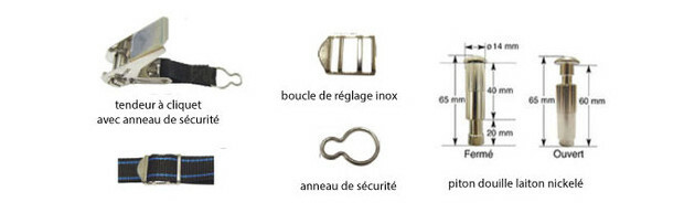 - Pitons douille et anneaux de sécurité avec boucle de réglage inox sur les côtés restants.