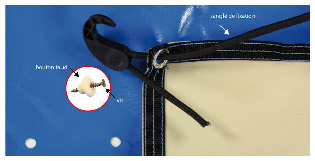 - Fixation : boutons taud, vis à bois et sandow périphérique.