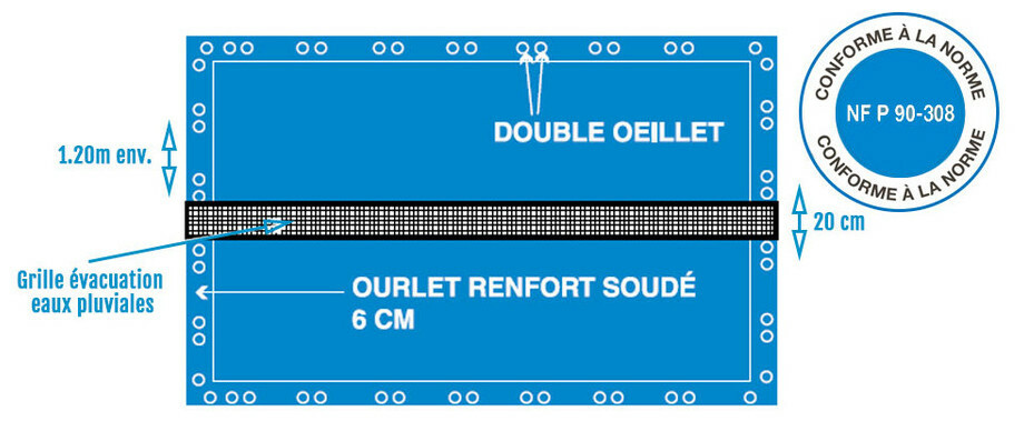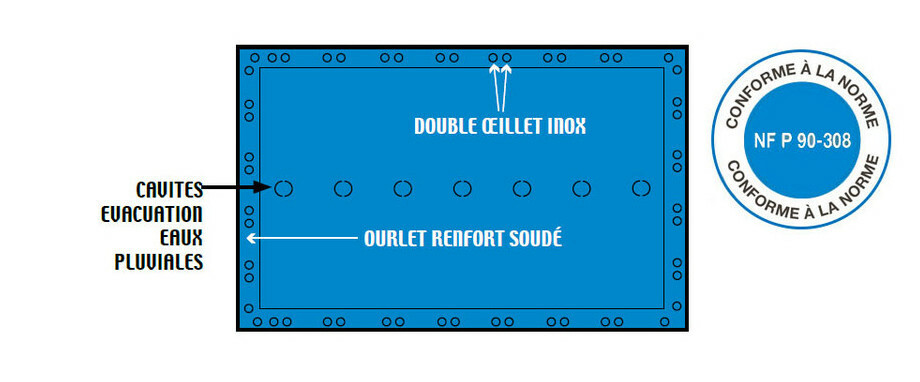 - Bâche en polyester revêtement PVC anti-UV et anti-cryptogamique, poids 580 g/m².