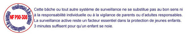 Les bâches à barres de sécurité pour piscines bois Woodfirst Original sont conformes avec les normes en vigueur relatives à la protection des piscines à usage individuel ou collectif (AFNOR NF P 90 - 308). Tests effectués par le Laboratoire National d'Essais.