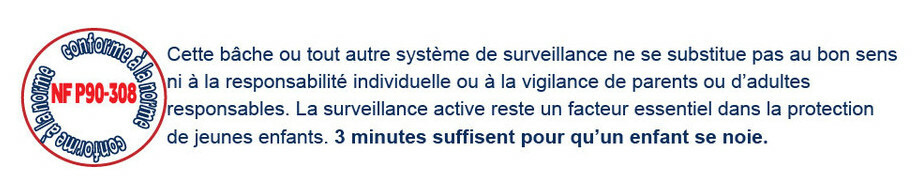 Les bâches à barres de sécurité pour piscines bois Woodfirst Original sont conformes avec les normes en vigueur relatives à la protection des piscines à usage individuel ou collectif (AFNOR NF P 90 - 308). Tests effectués par le Laboratoire National d'Essais.