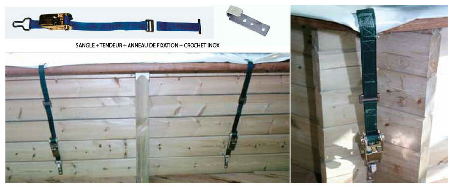 - Sangles de fixation à insérer dans les tendeurs à cliquets (face à face sur les largeurs du bassin), pour un positionnement précis et une protection contre les risques de soulèvement en cas de vent jusqu'à 90 km/h.