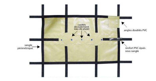 - Consolidation de la bâche : renforts PVC cristal sous sangles, doublure PVC dans les angles.