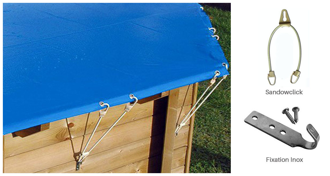 - Fixations : par crochets inox fixés sur la paroi avec vis inox et et sandowclicks individuels sable de sécurité avec passant d'arrimage