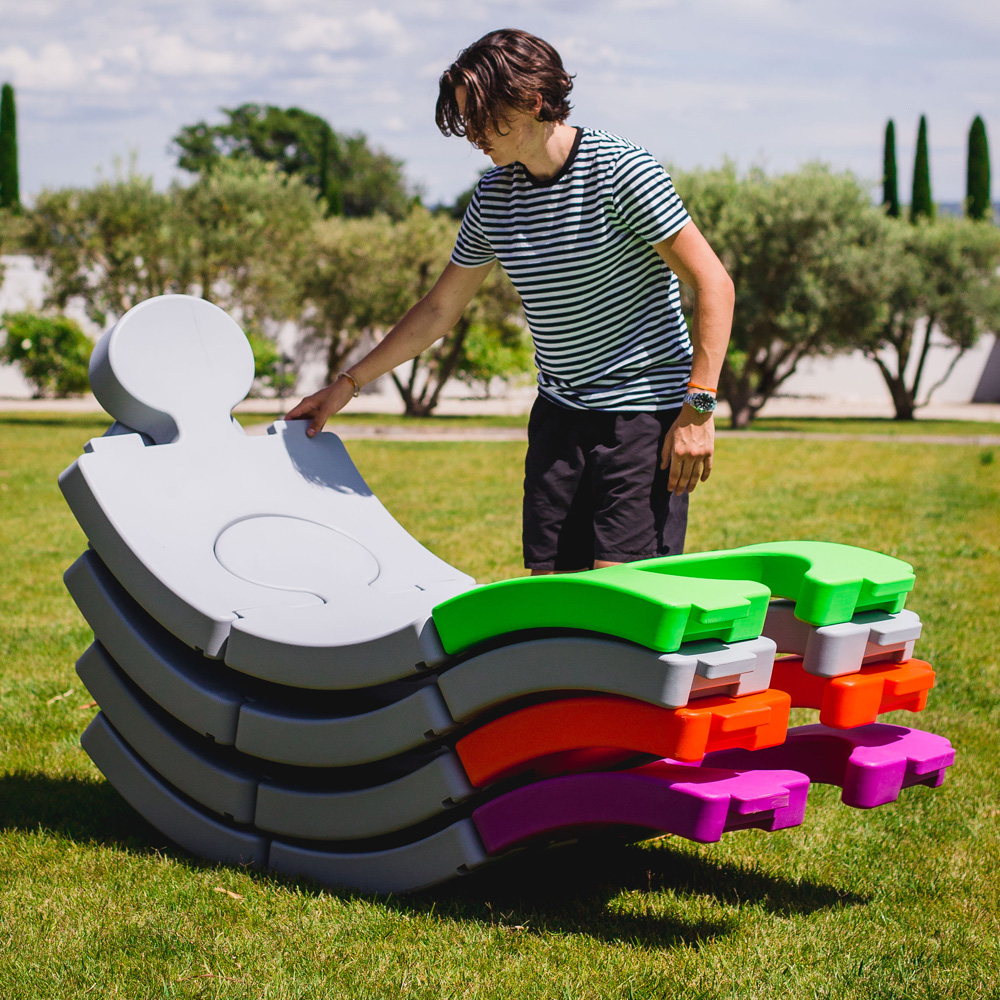 - Chaque transat est livré à l'unité et se range empilé pour un encombrement minimal.