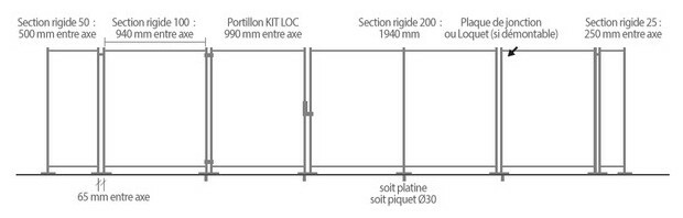 Il se fixe directement aux sections rigides de la barrière, et se fixe sur piquets (démontable) ou sur platine (permanent).