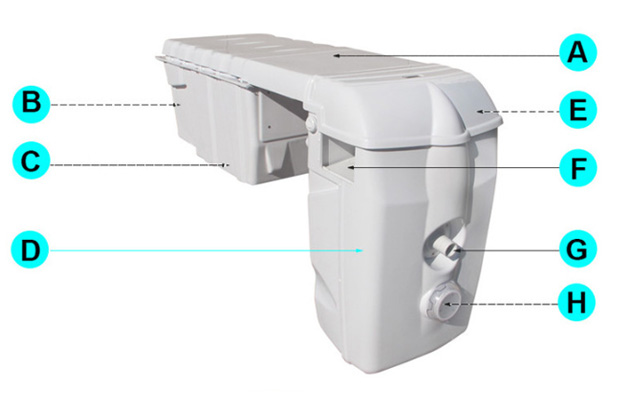 F. Deux skimmers (ouvertures pour l'aspiration de l'eau)