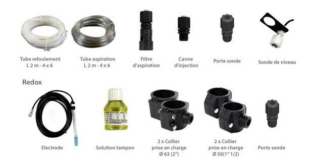 Sonde de niveau : permet de surveiller le niveau dans le bidon de chlore (arrêt de la régulation quand le produit est épuisé)