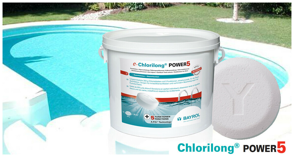 Le galet Chlorilong® POWER 5 de 200 grammes assure désinfection, prévention des algues, des dépôts de calcaire, floculation* continue et stabilisation du chlore. Ce galet de chlore 5 fonctions assure une eau cristalline et saine tout en respectant les revêtements. Il rassemble la puissance de matières actives sélectionnées rigoureusement et une nouvelle méthode de compression développée par Bayrol : la technologie A.P.O.®. Ce dispositif permet d'obtenir des galets de grande qualité. En effet les galets vont se dissoudre de manière très uniforme, libérant ainsi une quantité de chlore constante dans l'eau afin de mieux désinfecter le bassin.