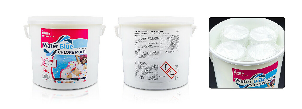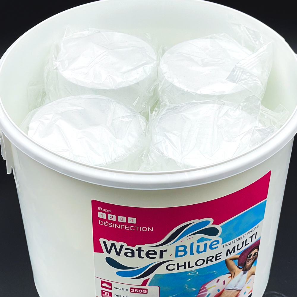 Les galets multifonctions 92% premium Waterblue permettent de simplifier le traitement d'une piscine. Un traitement apporte quatre actions, désinfectante, anti-algues, floculante et azurante. Waterblue chlore multifonctions est proposé en galets de 250 et 500g. Un carton contient 2 seaux de 5 kg chacun.