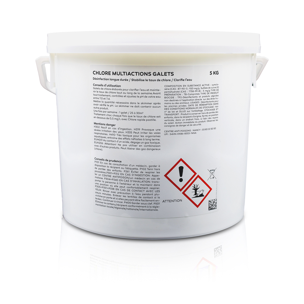 Chlore multifonctions est disponible en galets de 250g ou 500g Conditionnement : 1 carton = 2 seaux de 5 kg