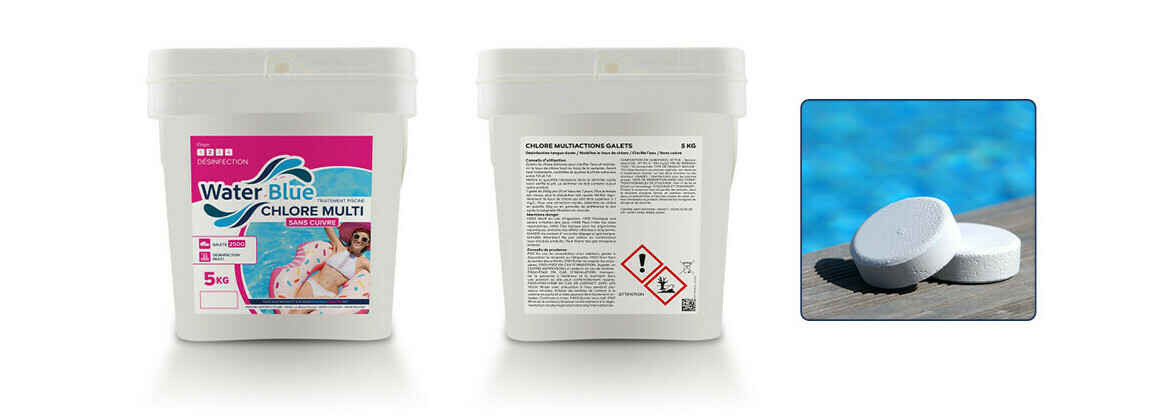 Waterblue chlore multifonctions sans cuivre conditionné en galets de 250 gr à dissolution lente qui permet d'assurer un traitement simplifié et complet de la piscine : Fonctions désinfectante, anti-algues, floculante et stabilisante.