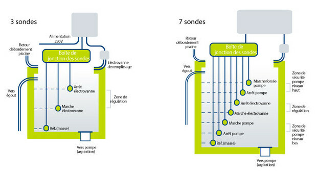 Coffrets électriques destinés à la gestion des piscines à débordement. Le coffret 3 sondes prend en charge le remplissage de la piscine, en commandant le fonctionnement de l'électrovanne. Le coffret 7 sondes gère la sécurité manque d'eau, le remplissage, la remise en route de la pompe à niveau haut (sécurité niveau haut).