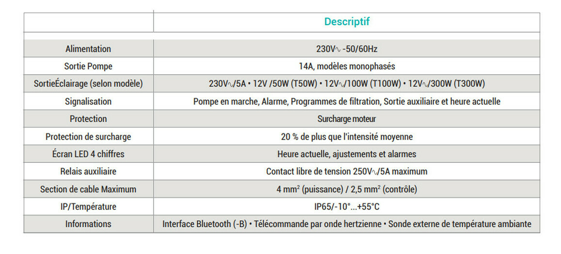 - Seul contrôle de filtration piscine avec contrôle de la pompe et de l?éclairage (on/off et couleurs) avec bluetooth - Application gratuite téléchargeable "HPOWER" - Toute l'électronique (disjoncteur, contacteur, timer) regroupée dans un seul et même module - 2 timers pour la filtration et 1 timer pour l'éclairage (selon modèle) - Auto calibration de la consommation de la pompe de filtration - Protection intégrée contre les surcharges - Plusieurs modèles : en fonction des besoins Transformateur 50, 100 et 300 W - Compteur horaire de fonctionnement, nombre de démarrages