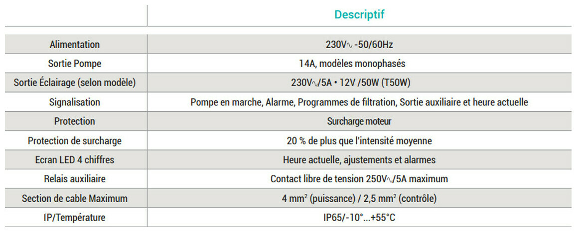 - Boîtier électrique pour pompe monophasée jusqu'à 3 CV - Toute l'électronique (disjoncteur, contacteur, timer) regroupée dans un seul et même module - 2 timers pour la filtration et 1 timer pour l'éclairage (selon modèle) - Auto calibration de la consommation de la pompe de filtration - Protection intégrée contre les surcharges - Plusieurs modèles : en fonction des besoins - Transformateur 50, 100 et 300 W - Compteur horaire de fonctionnement, nombre de démarrages