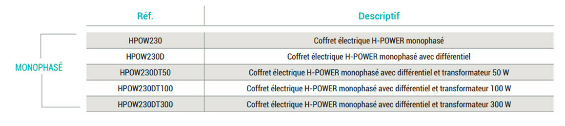 Ce coffret électrique est disponible en 2 modèles : - Coffret électrique H-Power : monophasé avec différentiel pour le fonctionnement de la pompe de filtration avec une horloge permettant une programmation. - Coffret électrique H-Power monophasé avec différentiel + transformateur : 50 W - 100 W et 300 W en plus de la pompe, 1 ou plusieurs projecteurs peuvent être branchés.