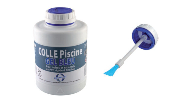 Colle PVC Interfix, texture gel de couleur bleue, permet l'encollage des raccords et tuyaux d'un système hydraulique. Couvercle sécurisé avec pinceau intégré