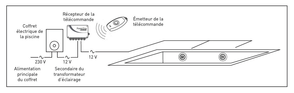 - Ce coffret Powerline doit être alimenté par le circuit secondaire d'un transformateur doublement isolé conforme à la réglementation d‘usage de LED en piscine. (Primaire : ~230V / Secondaire : ~12V).