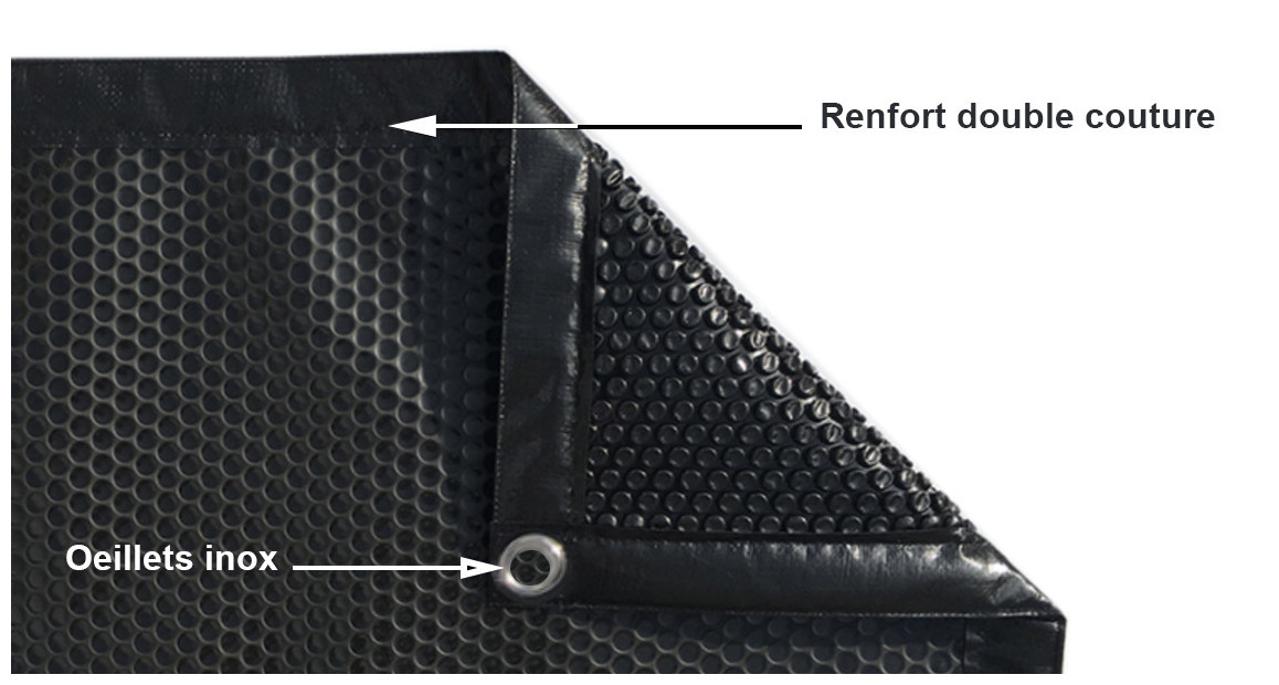 Bordée sur les 4 côtés et entièrement renforcée par du polyéthylène cousu sur tout le périmètre (2 piqûres), cette bâche à bulles Quatro d'une épaisseur de 400 microns garantit la résistance et la pérennité.
