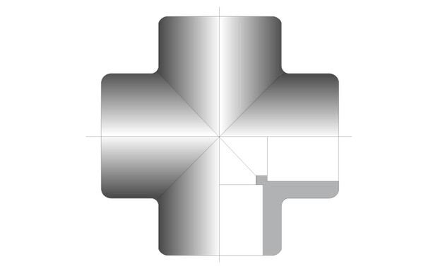 Raccord hydraulique 90° en croix, femelles à coller. Existe en 4 diamètres en PN 16 (Ø32 - Ø50 - Ø63 ) et en Ø75 en PN 10