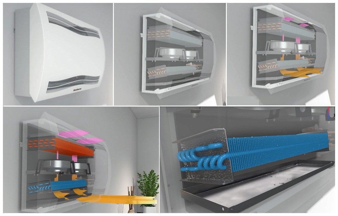 Son ventilateur aspire l'air ambiant humide provenant de la pièce et le dirige sur l'évaporateur. L’air est refroidi sous le point de rosée et la vapeur d’eau ainsi condensée est recueillie par le bac d’égouttage et est évacuée. L’air maintenant sec passe ensuite sur le condenseur où il est réchauffé avant d’être réintroduit dans le local.