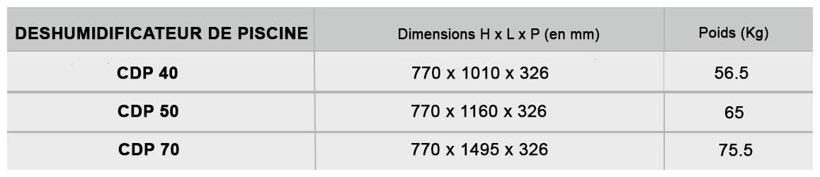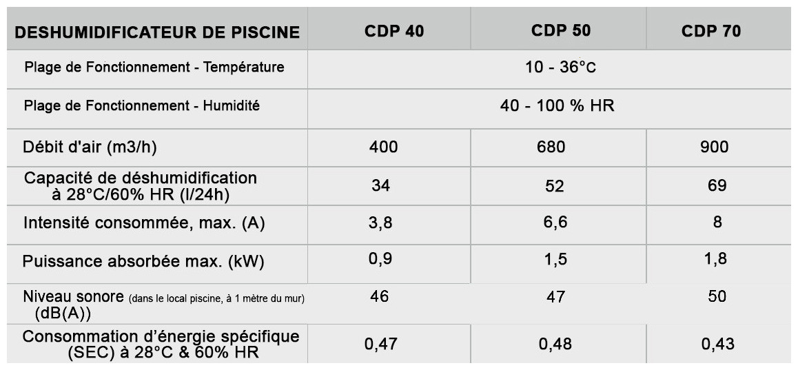 Conçus avec un souci de qualité, de fonctionnalité et d’économie d’énergie , les déshumidificateurs de piscines CDP 40-50-70 sont équipés de ventilateurs EC et de compresseurs ultra-performants qui garantissent une consommation d’énergie très faible.
